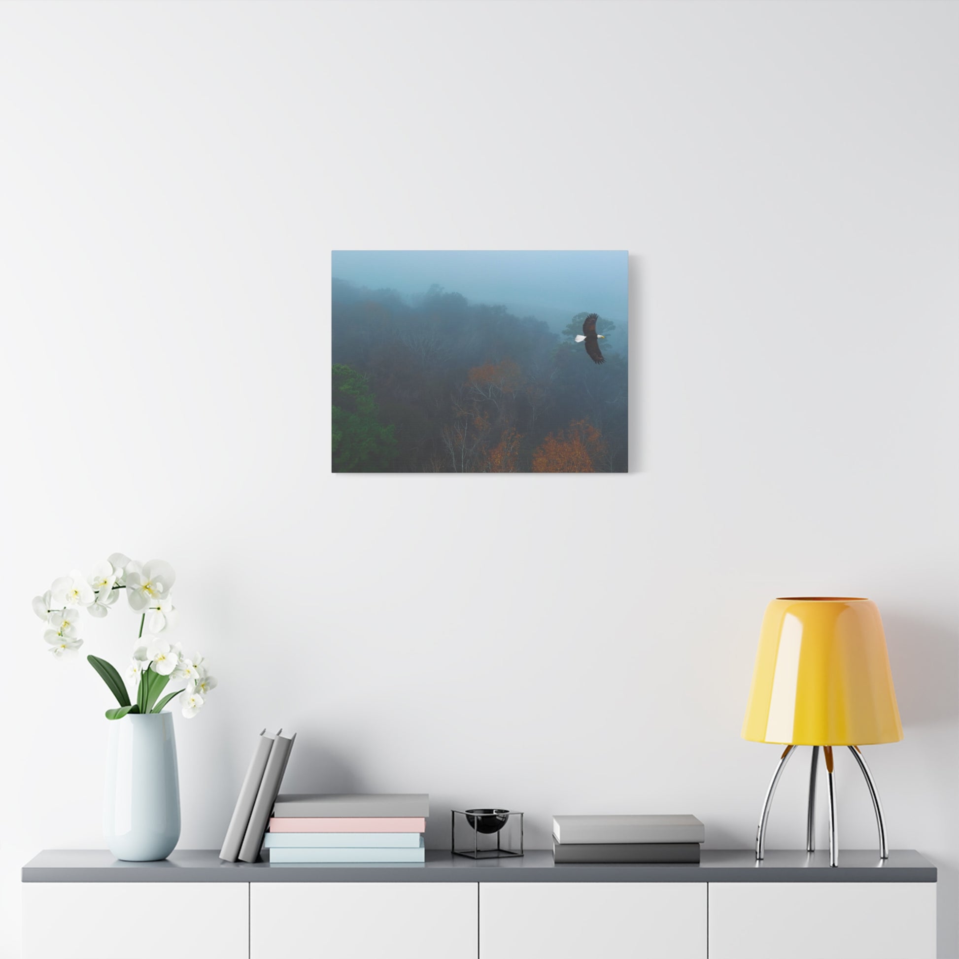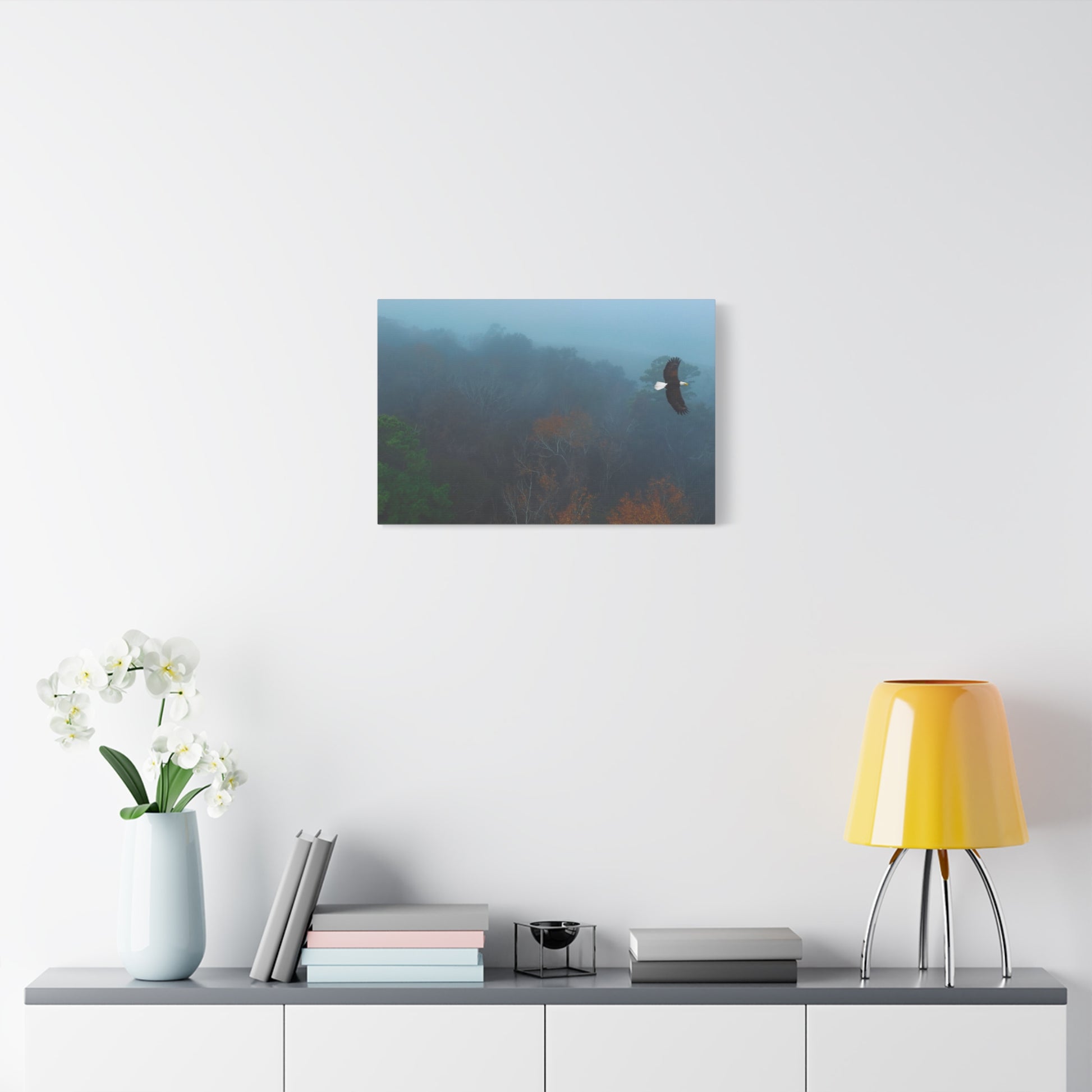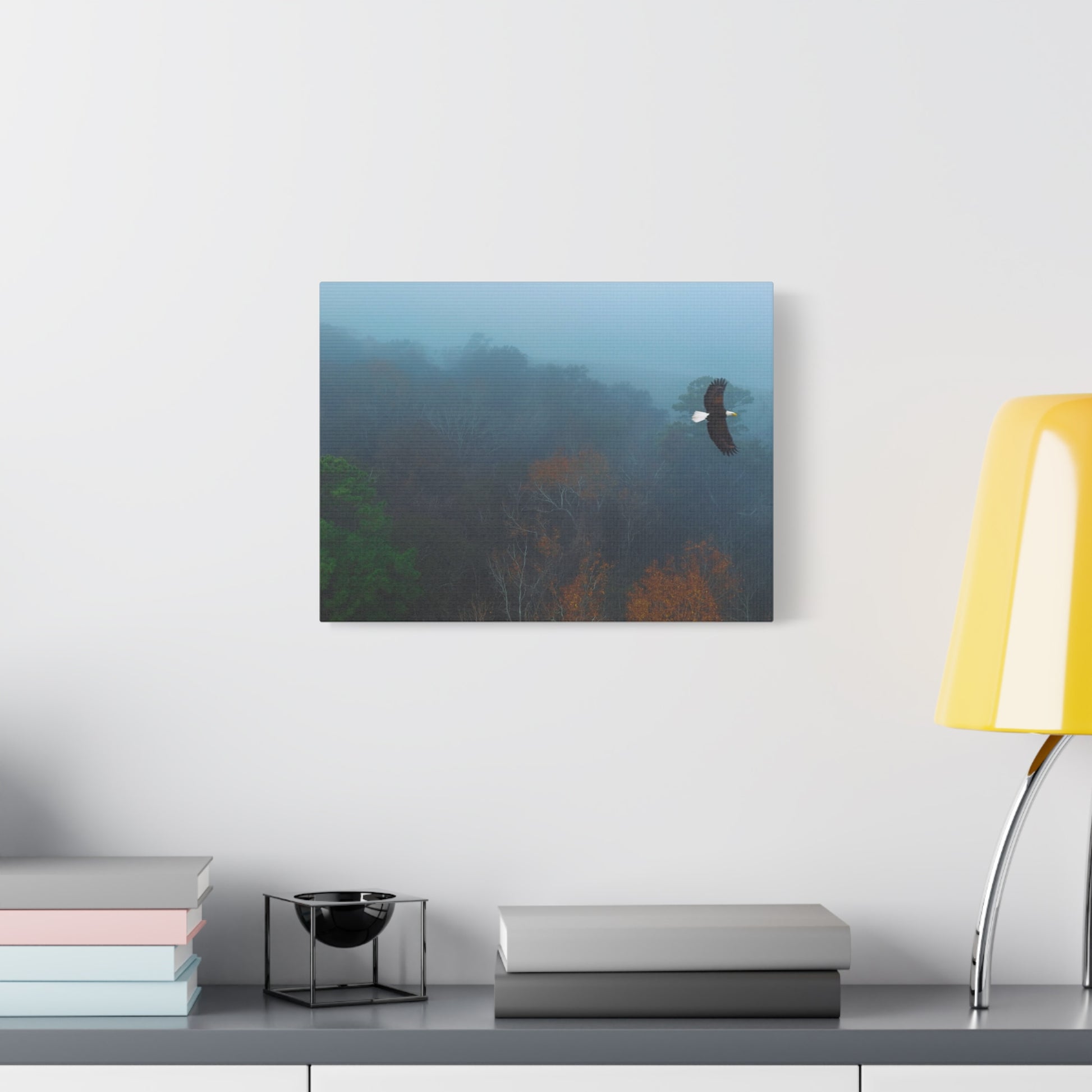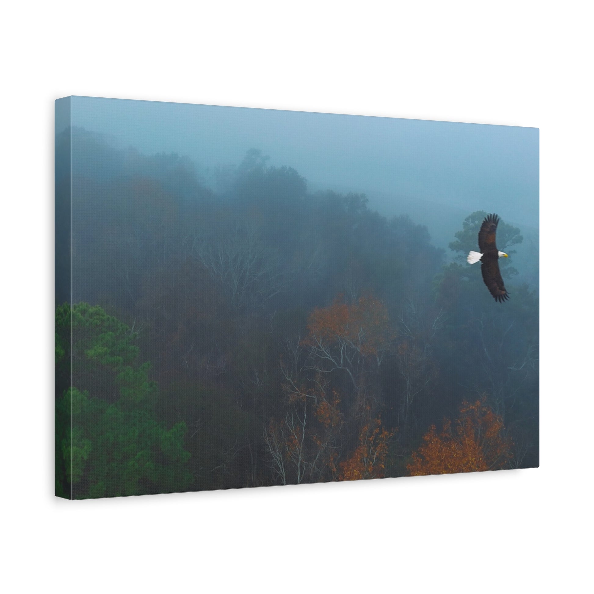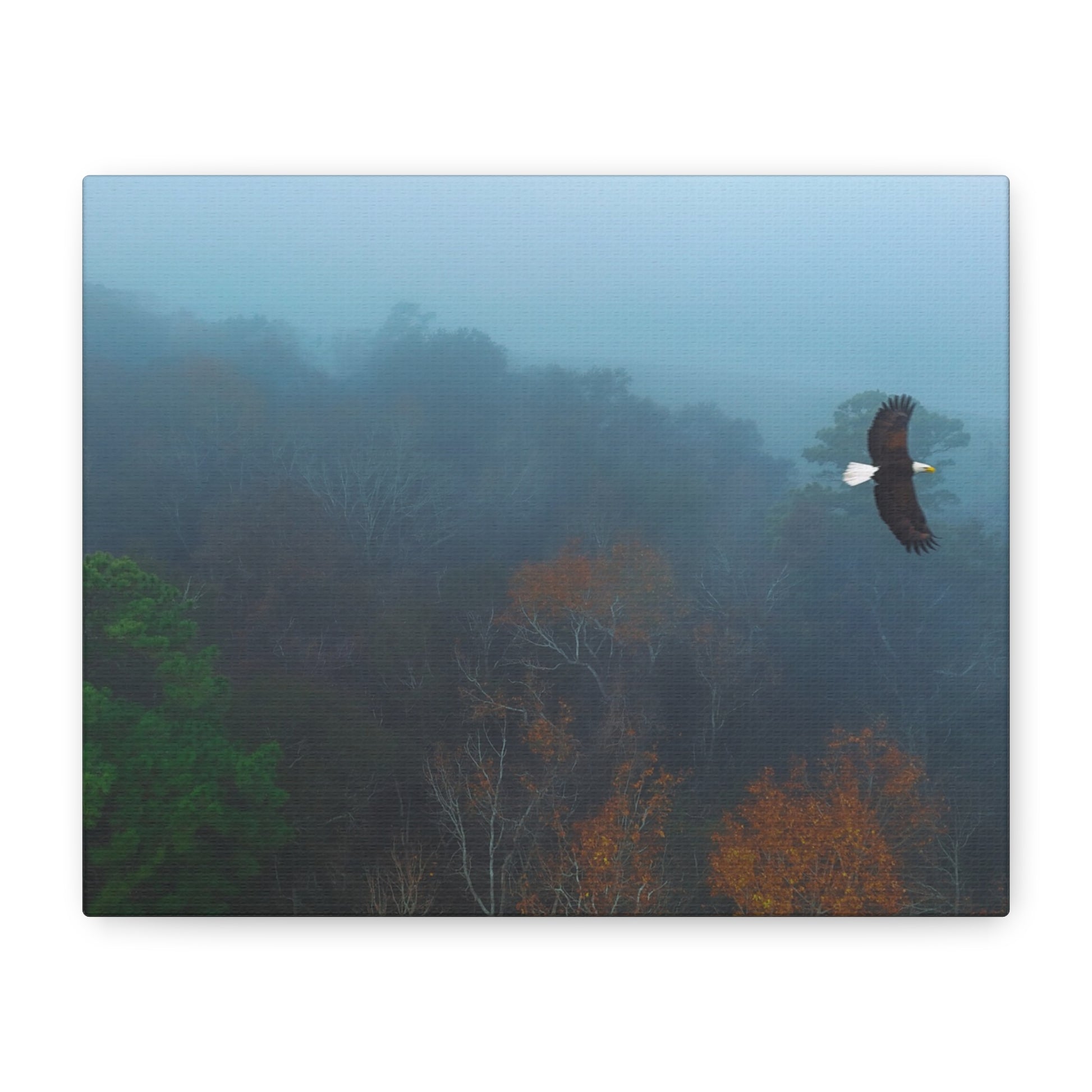 A serene matte canvas print that brings a quiet, early-morning woods into your home. Cool blue fog drifts over distant tree tops while an eagle glides through the mist a moment of stillness and gentle motion captured on stretched canvas. The 1.25" depth gives it a clean, modern presence on the wall without overwhelming a room. Hang it above a console, in a reading nook, or in a bedroom to invite a calm, reflective mood that feels like a slow walk through a favorite forest at dawn. The muted palette and soft edges let it blend easily with natural, rustic, or minimalist decor, and the subtle texture of the matte finish keeps glare low while adding depth to the printed image.
