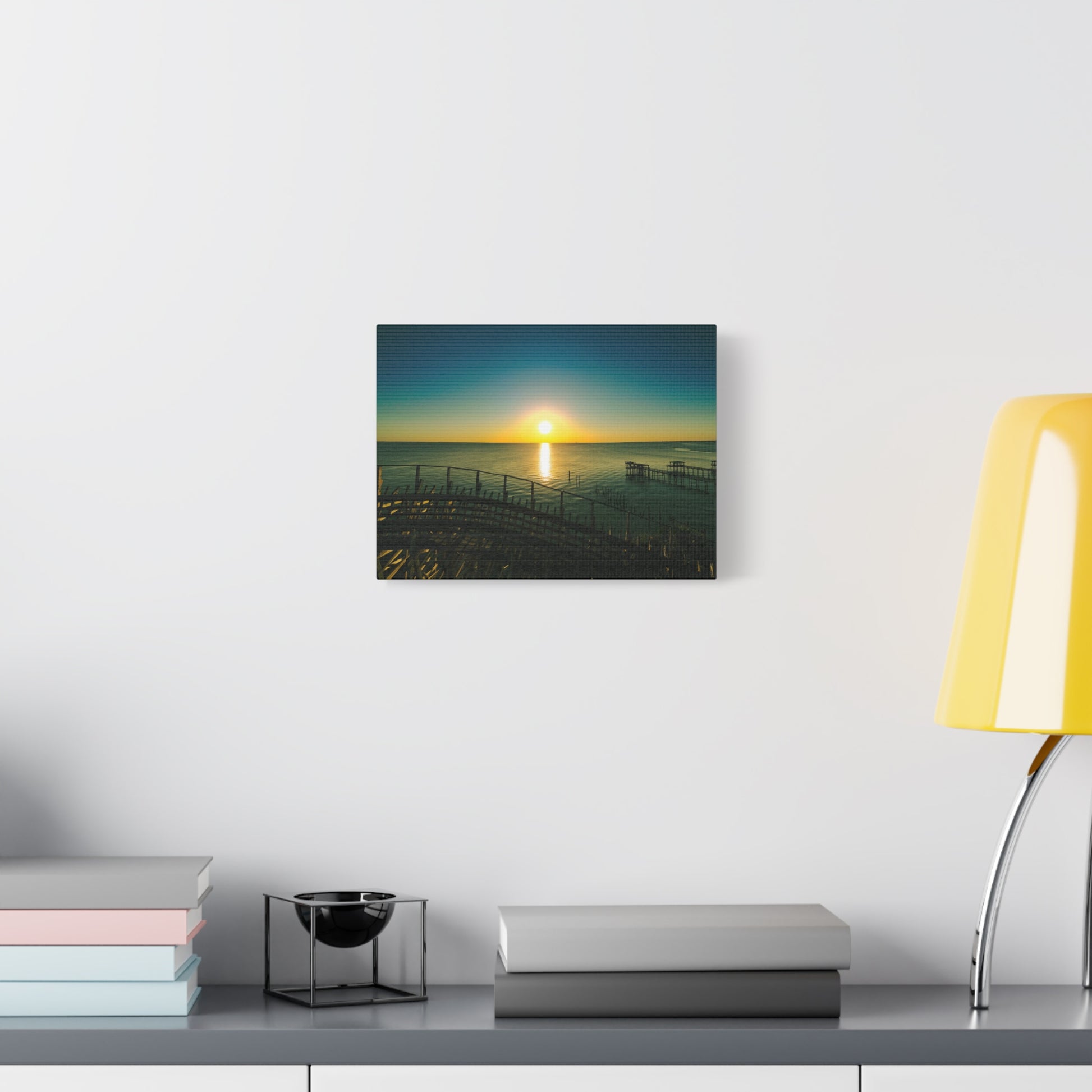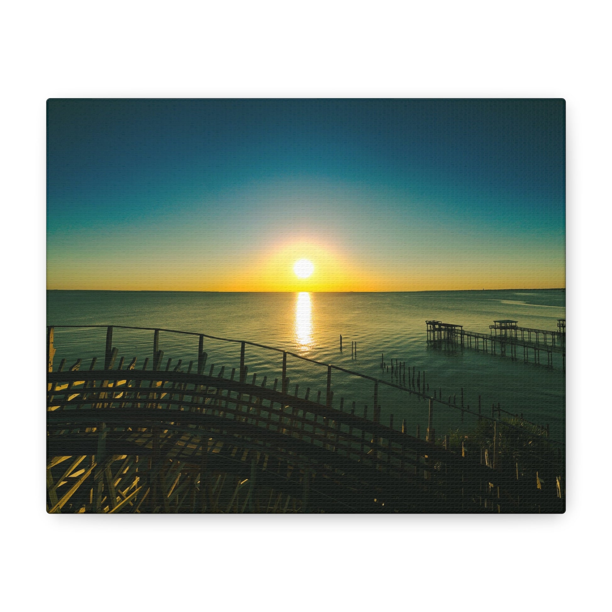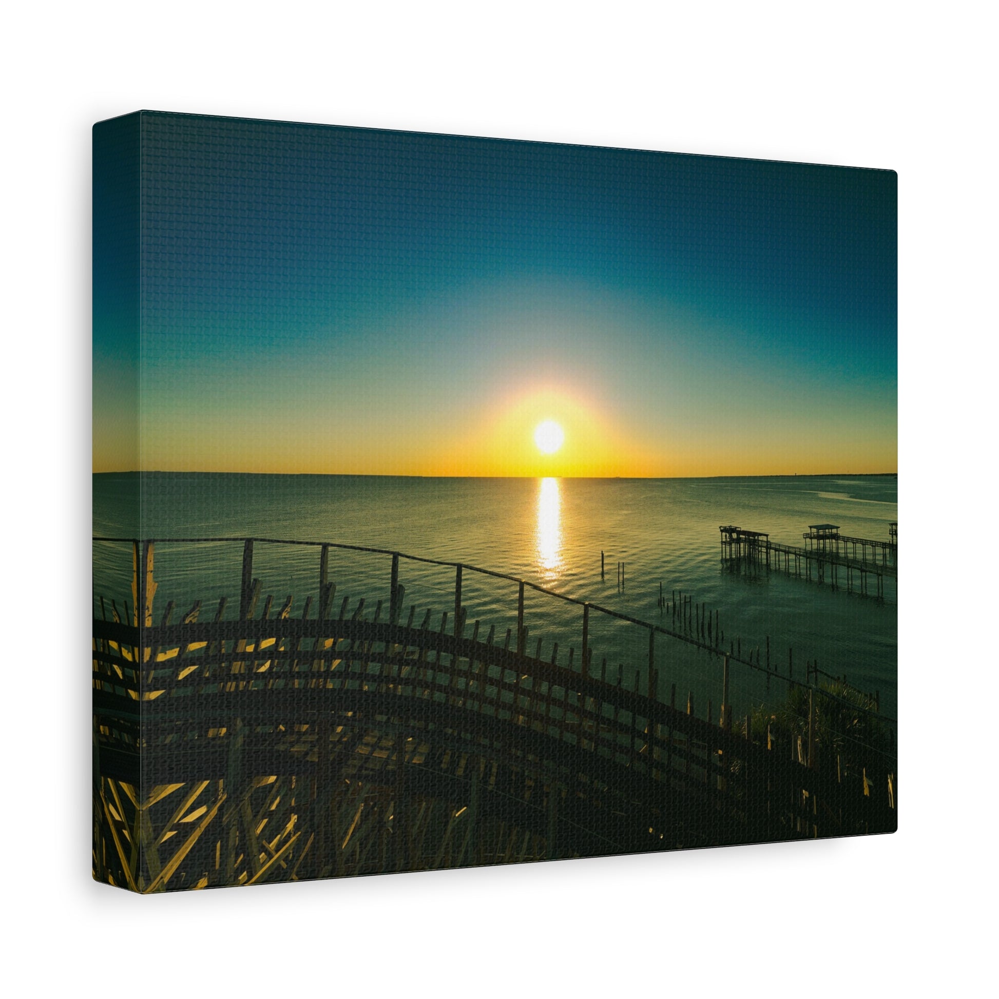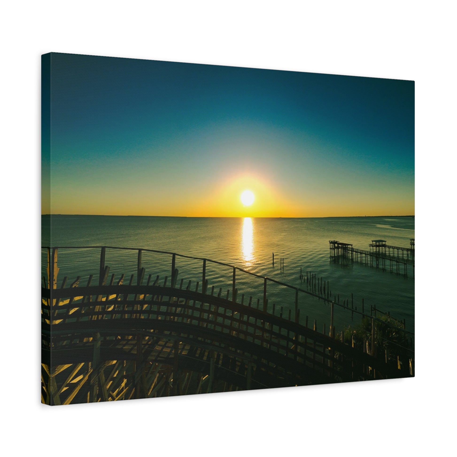 A stretched matte canvas print that brings a quiet coastal sunrise into your room. The image captures golden light spilling over calm water, the long reflection drawing the eye toward the horizon while silhouetted boardwalk curves add structure and a nostalgic seaside mood. Mounted on a slim 1.25" pine frame, the matte surface softens glare and gives the colors a velvety, museum-like finish.— warm ambers and deep teals that calm a living room, entryway, or home office. This piece sits comfortably in modern, coastal, or vintage-inspired spaces and invites slow mornings and the feeling of salt air and stillness.